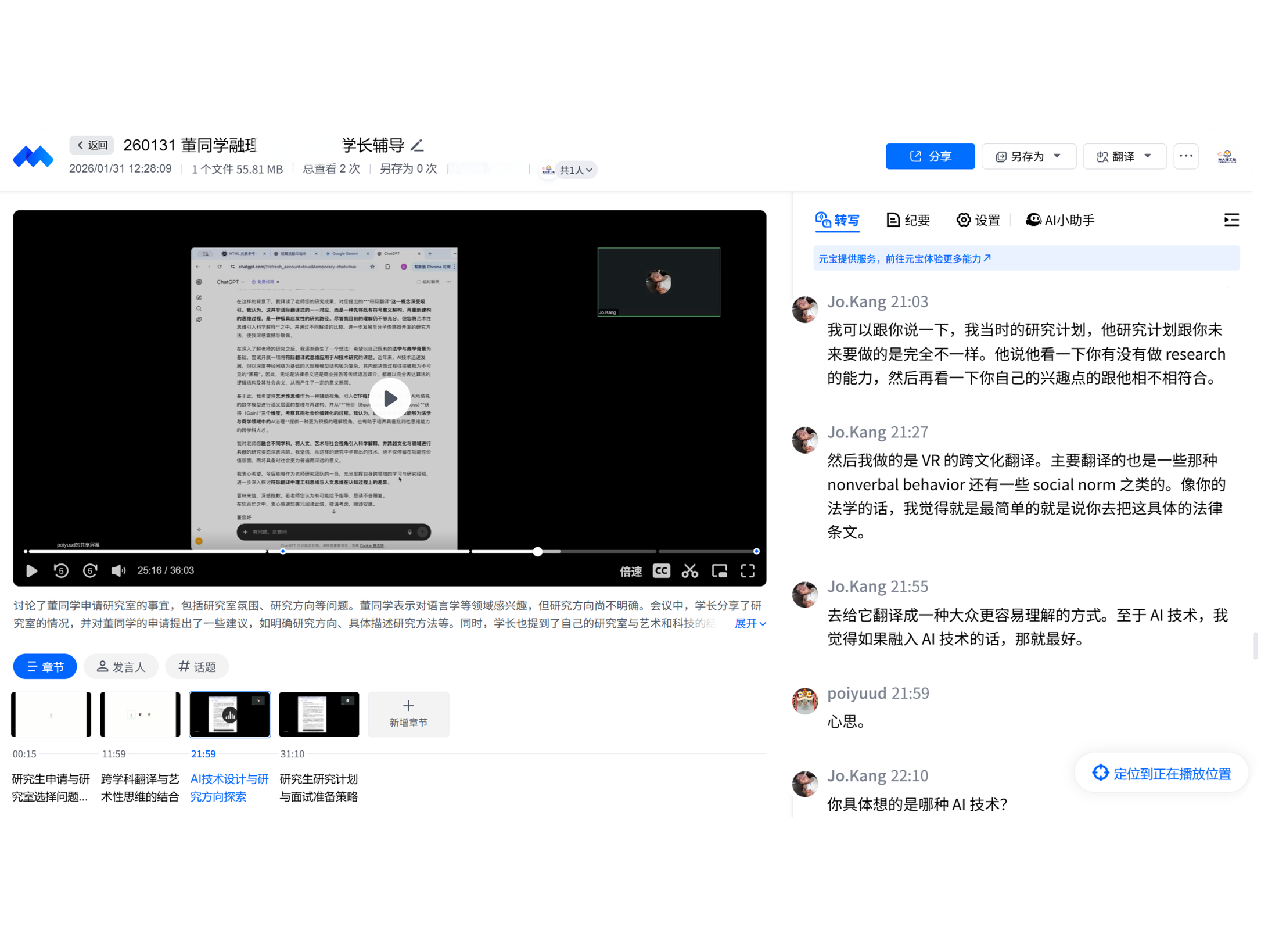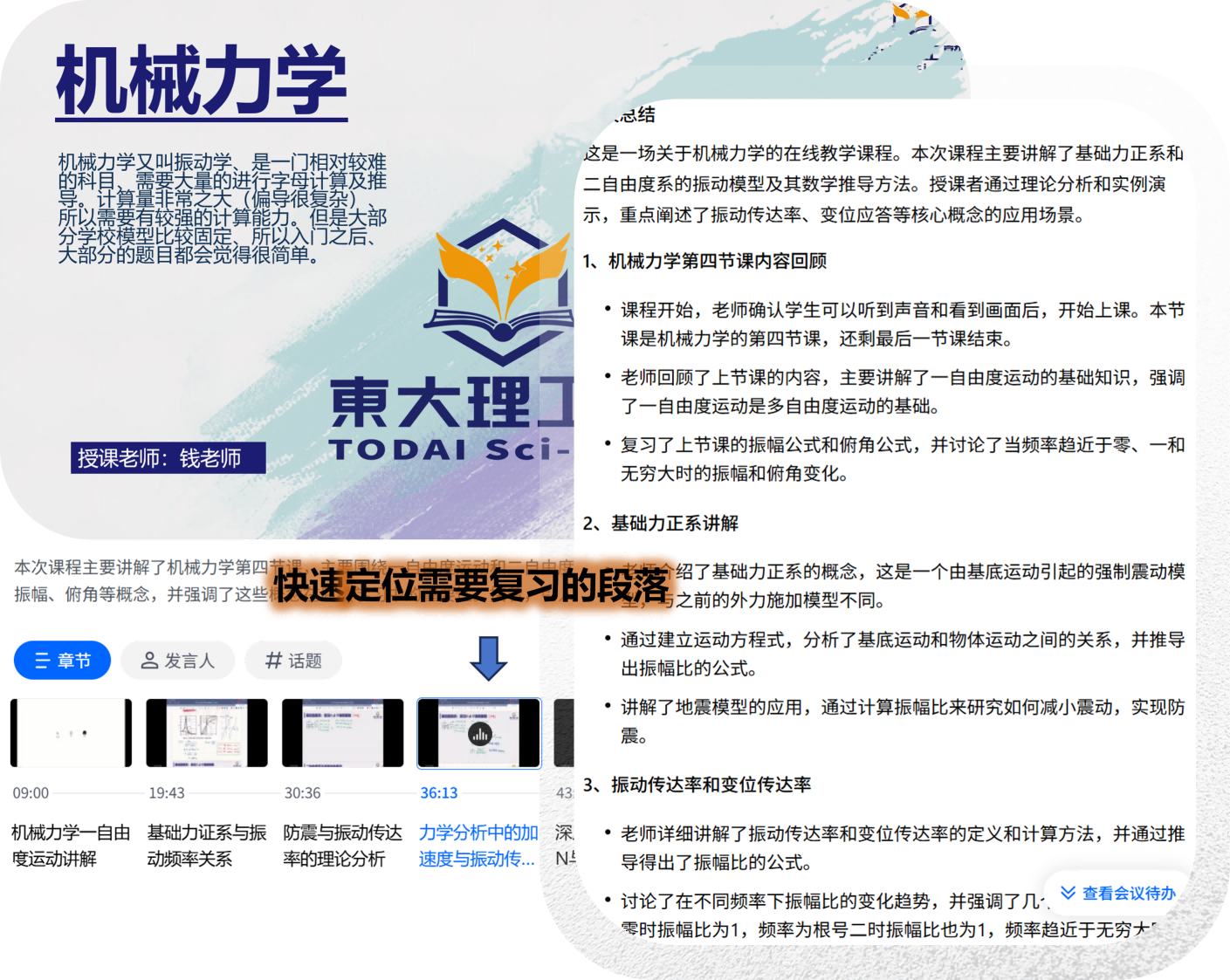 精准引入 AI 辅助工具,对课程录像与会议内容进行整理与分析, 自动提取重点知识、结构化归纳核心内容,帮助学生快速定位复习重点, 把有限时间真正用在「该学的地方」。