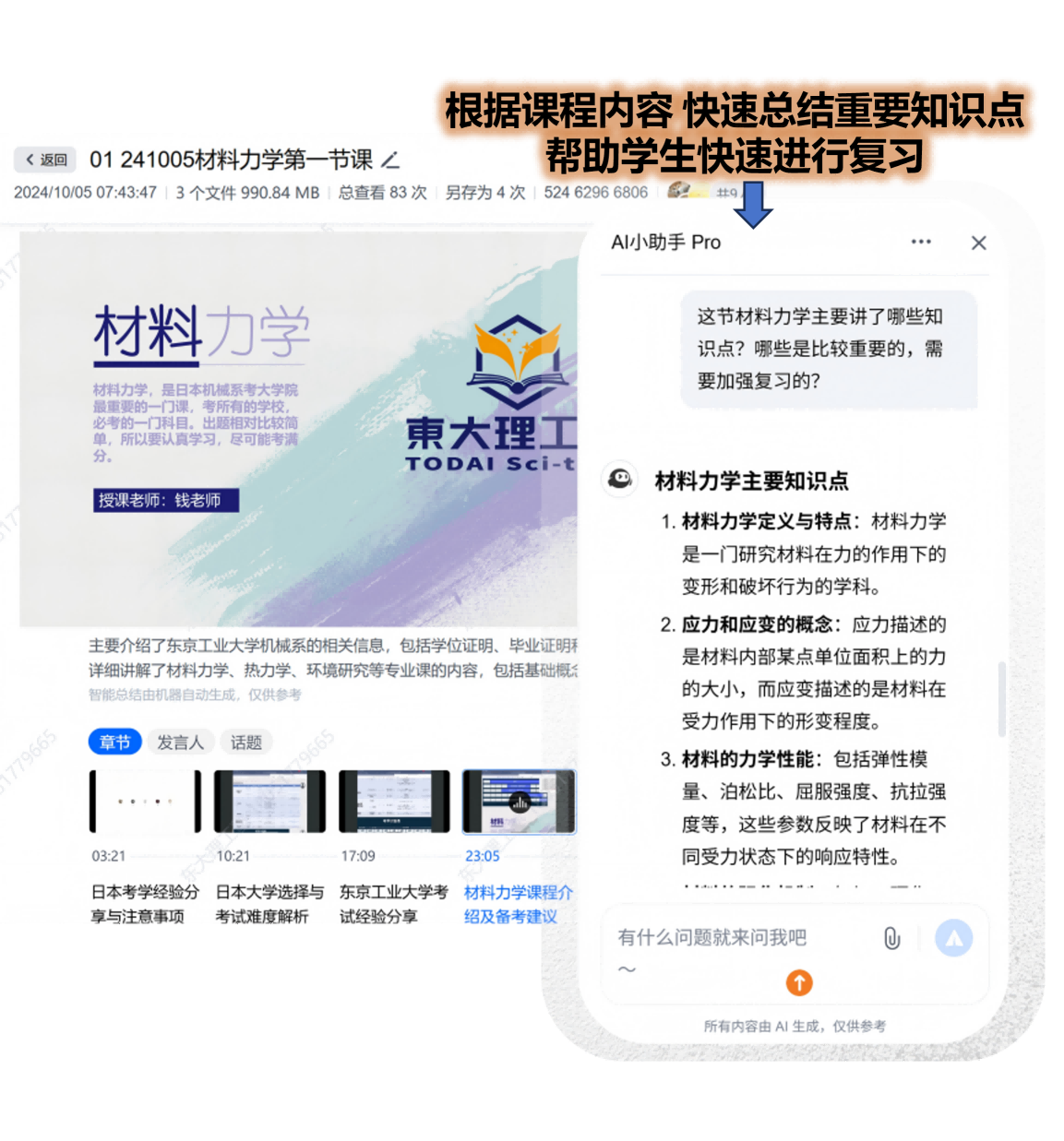 基于课程视频与课堂内容, 对不懂的问题进行快速总结与解答, 帮助学生高效理解重点,提升复习效率。
